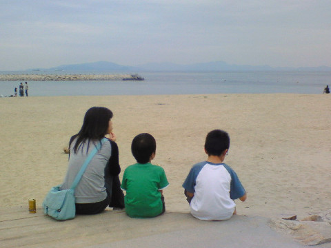 ラスクをほおばりながら、海を眺める奥さんと小僧達。