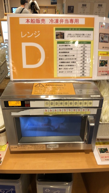 備え付けの電子レンジ(これも数台あり)で、指定通りに温めるだけ。