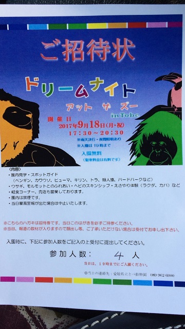 夜は家族でノア号にて、とべ動物園に行ってきました。
