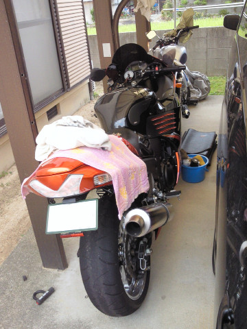 愛機ZZR1400を自宅前で洗車していた。